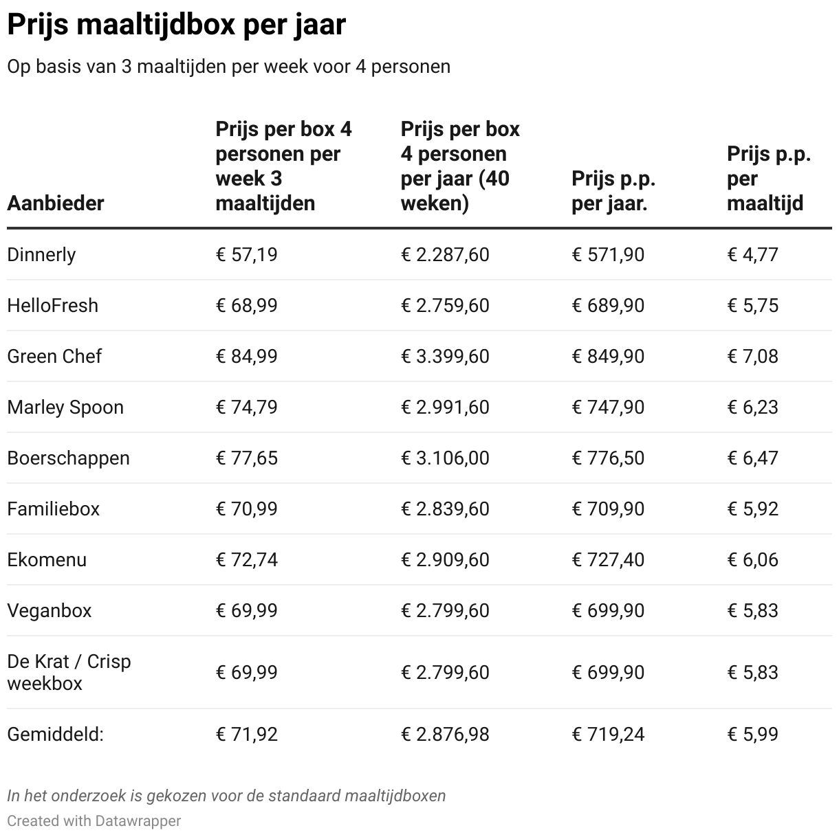 In het onderzoek naar de prijzen is gekeken naar een gezin van 4 personen dat 40 weken per jaar een maaltijdbox afneemt met 3 gerechten per week. Dit omdat in vakanties en tijdens feestdagen de maaltijdboxen vaak worden gepauzeerd en we in het vorige onderzoek met dezelfde voorwaarden hebben gewerkt. Verder is gekeken naar het totaalplaatje van de maaltijdboxen dus alle prijzen zijn inclusief bezorging en zonder kortingen.