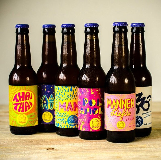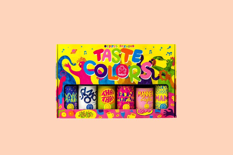 Een bierpakket in een geschenkverpakking van de Amsterdamse brouwerij Oedipus met zes verschillende bieren in een vrolijke doos